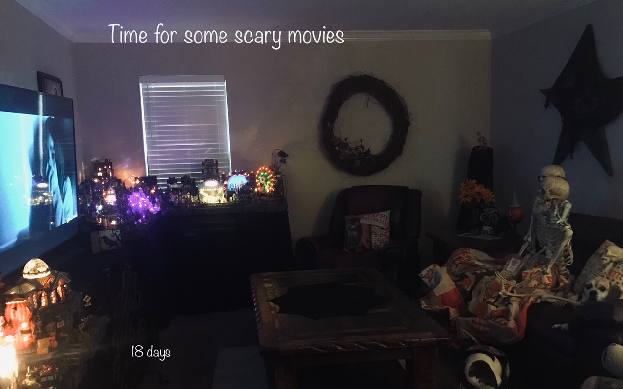 Their friend, Dave (Skeleton), from Texas (thank you Jessica) after a days search for the Halloween Spirit, took time out to watch scary movies with friends. Though the wrong dates continue on his pictures. Fifteen days Dave and Jessica!