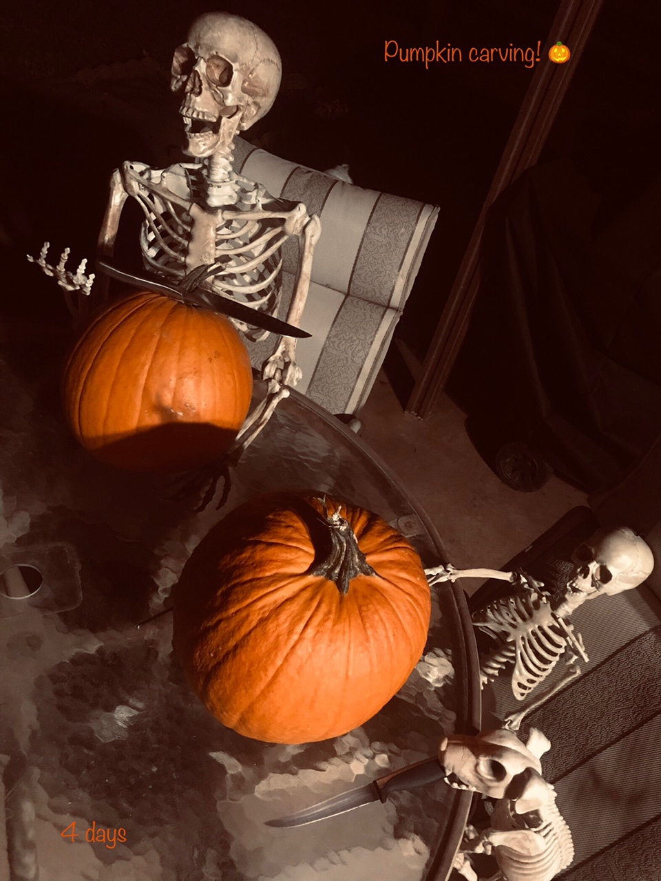 Their friend, Dave (Skeleton), from Texas (thank you Jessica) after a weeks of searching for the Halloween Spirit delighted at Toil and Trouble’s news., Dave, Mort, Buster and little one celebrated by carving their Halloween Pumpkins.