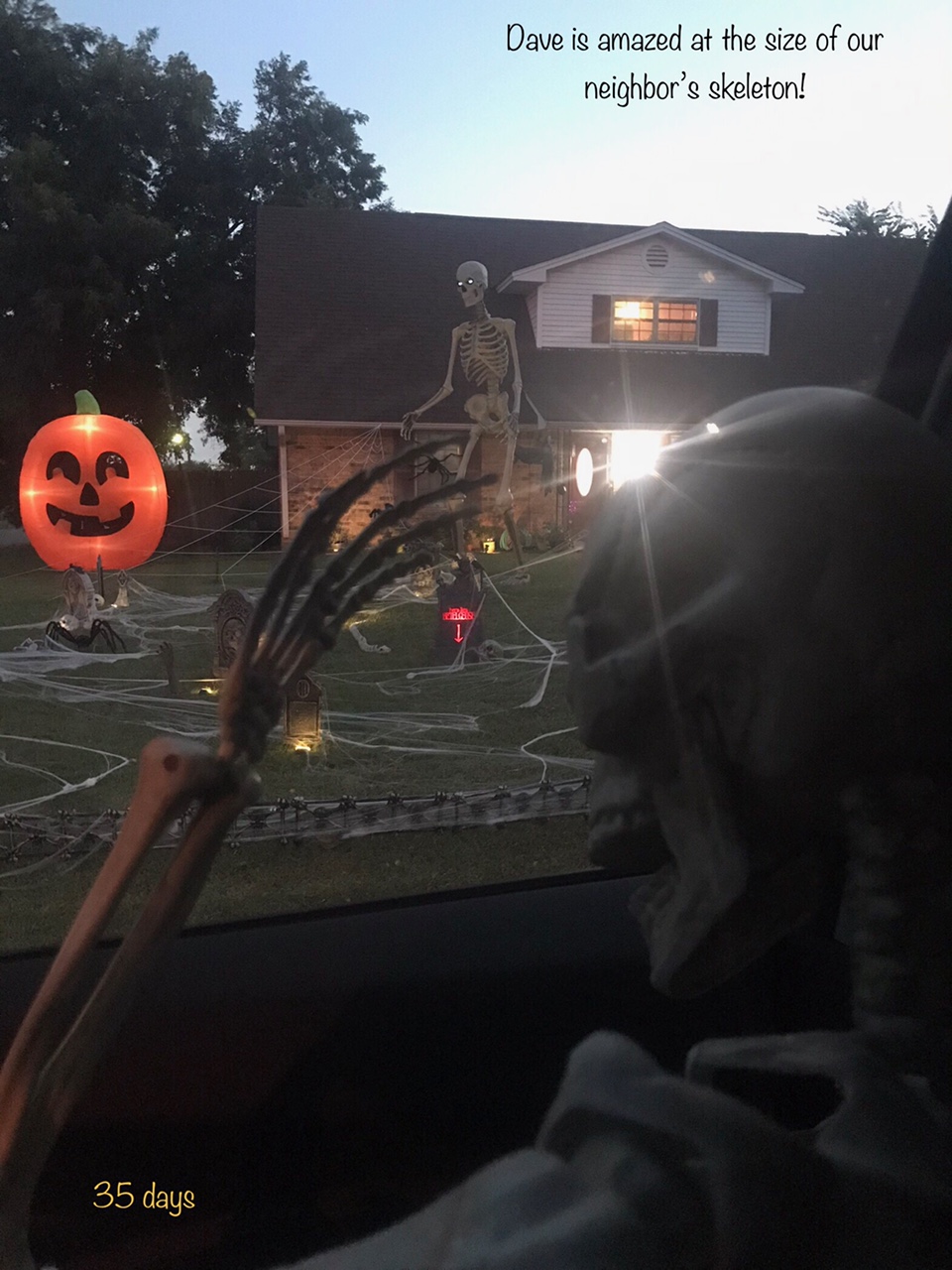 Their friend, Dave (Skeleton), from Texas (thank you Jessica) was shocked at the size of the skeleton in their neighbor’s yard while searching for the Spirit of Halloween. After his initial shock, he continued the search every where and came up empty. Though he did talk with Jessica about getting him a corrected calendar. He claims it’s still her fault for the incorrect dates on his pictures. Twenty-two days Dave and Jessica!