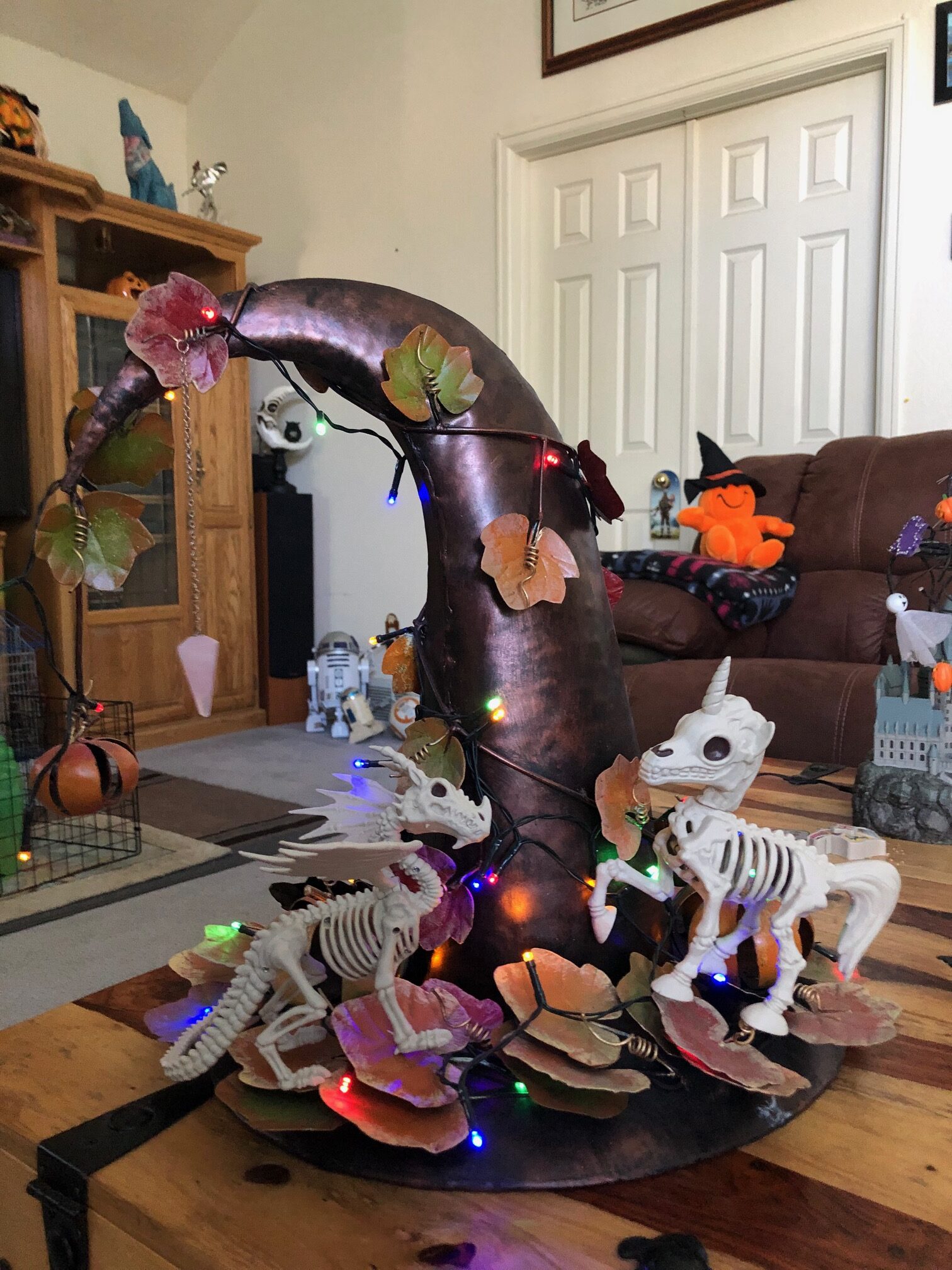 Well, October is finally here with cooler days and chilly nights. Yippee! As we continue the annual Halloween countdown, the aspens are beginning to turn gold and the Colorado high county received its first dusting of snow. Toil (Unicorn) and Trouble (dragon) are hard at work in search of the Halloween Spirit. This week they crept around the house and discovered a huge witch’s hat with lights. They searched under the leaves, under the hat no Spirit of Halloween. Toil and Trouble were totally disgusted and called Dave told him about the witch’s hat but no spirit. So the search continues.
