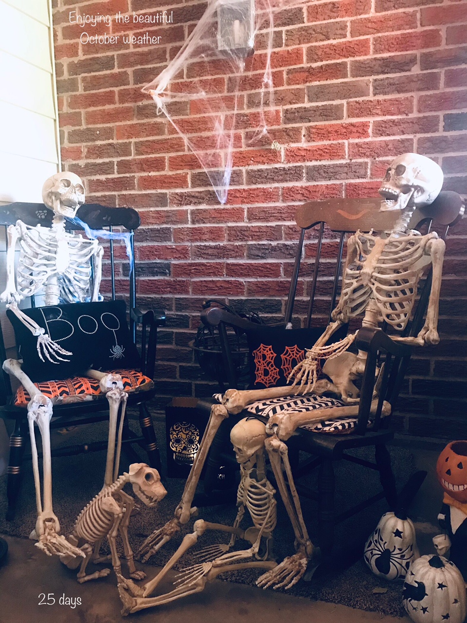 Their friend, Dave (Skeleton), from Texas (thank you Jessica) after a days search for the Halloween Spirit, after calling in friends to help in a long day of searching, Dave, Mort, Buster and little one took a much needed rest enjoying the beautiful October weather. Though the wrong dates continue on his pictures. Eight days Dave and Jessica!